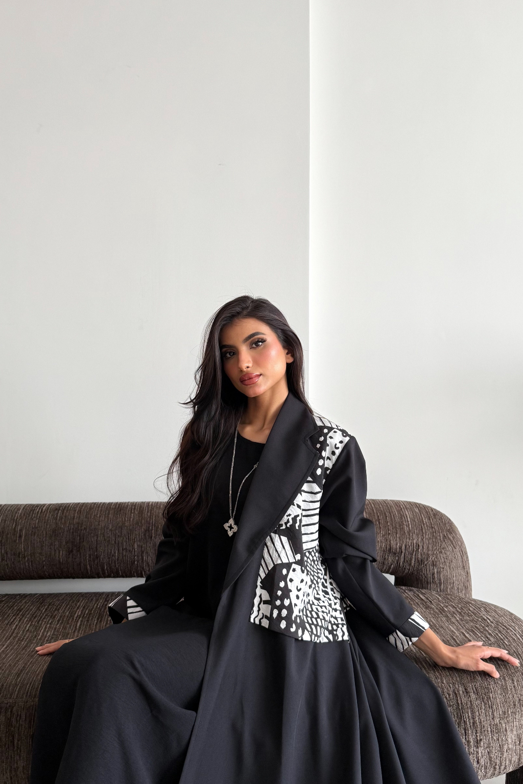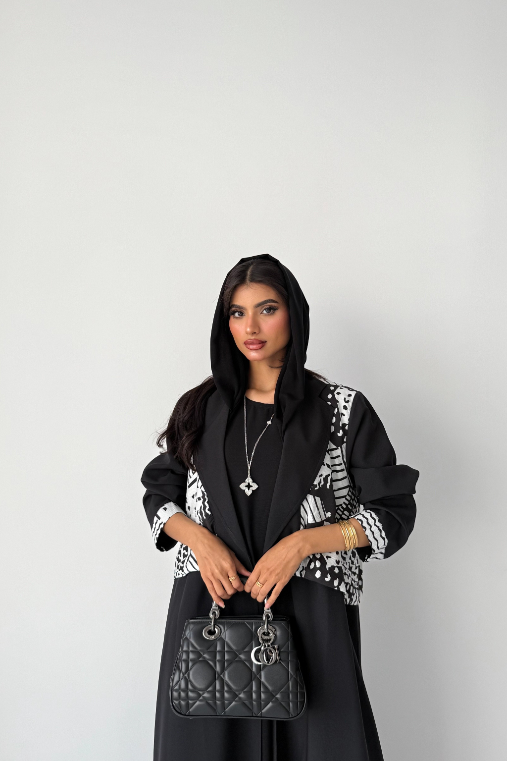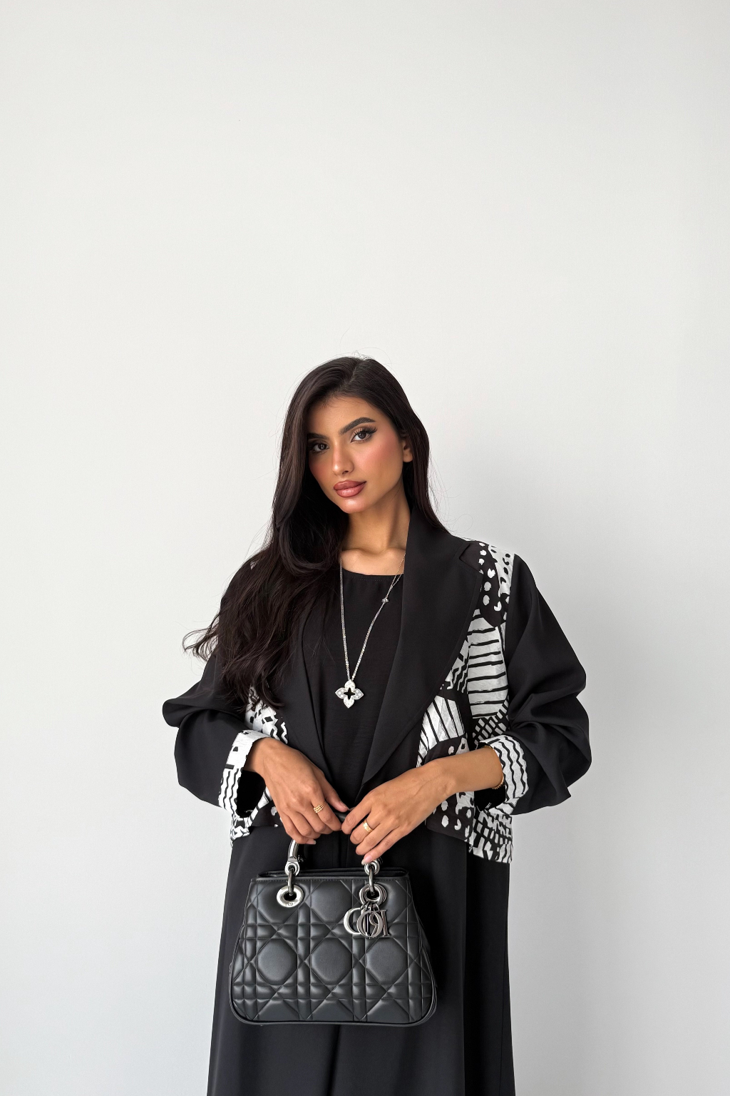 تمزج عباية سوداء أنيقة بين الطابع الكلاسيكي واللمسات العصرية لتمنحك إطلالة أنيقة تناسب مختلف المناسبات. بتصميمها الهندسي البسيط مع نقوش واضحة باللونين الأبيض والأسود على أرضية سوداء راقية، تصبح هذه القطعة واحدة من أجمل العبايات السوداء الأنيقة المناسبة كـ عباية خروج عصرية أو لإطلالات رسمية. تأتي مصنوعة من قماش الكريب الناعم المعروف بجودته العالية مع بطانة من جاكيت قصير من اللينن يضيف لمسة عملية وانتعاشاً مميزاً، لتجمع بين المتانة والراحة في ارتداء طويل الأمد.