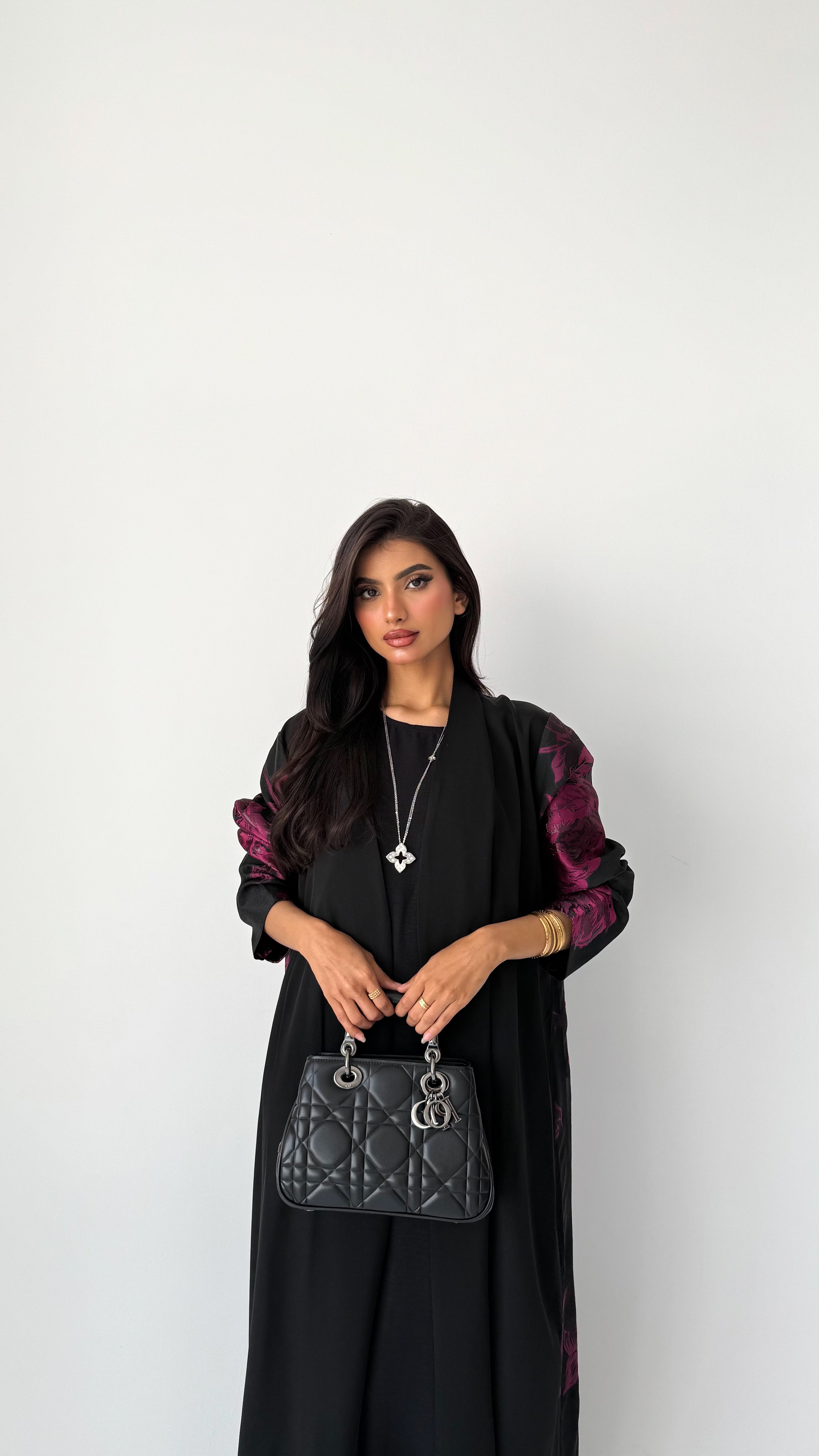 ٦٠٠عباية سوداء مطرزة من سيلڤيرا تمنحك إطلالة ملكية جريئة تجمع بين الفخامة والعملية. تأتي باللون الأسود الأنيق المزدان بزهور فوشية لافتة على الخلف والأكمام، مع تصميم أمامي من قماش الكريب التايواني الفاخر. هذه العباية خيار مثالي لكل سيدة تبحث عن عبايات أنيقة تضيف لمسة مميزة إلى خزانتها اليومية، فهي تصلح كـ عباية خروج أو للمناسبات الخاصة، بفضل تصميمها المتوازن الذي يجمع بين البساطة والجرأة.